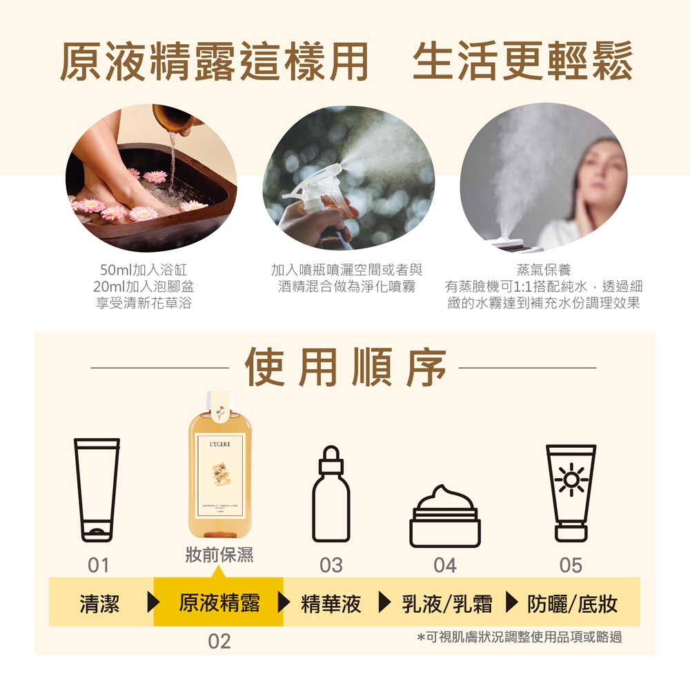 #單獨使用:作為護膚的第一步,將原液精露取適量在手心或化妝棉上,輕按至吸收滋潤肌膚。