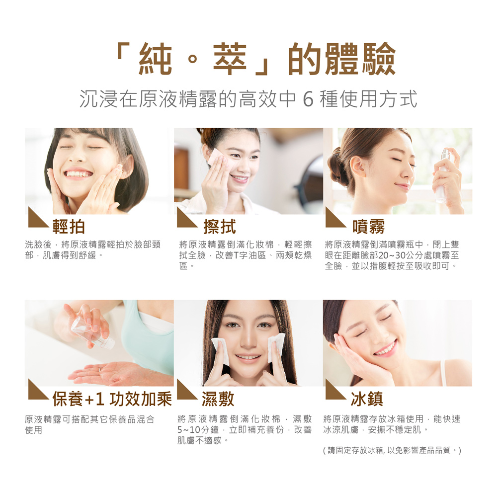 #單獨使用:作為護膚的第一步,將原液精露取適量在手心或化妝棉上,輕按至吸收滋潤肌膚。